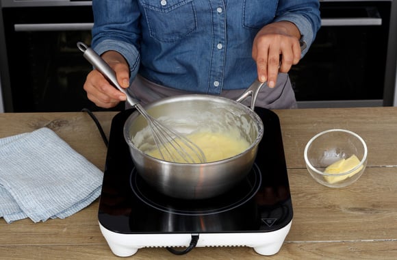 Reversez dans la casserole puis fouettez sur feu doux afin de faire épaissir la crème.