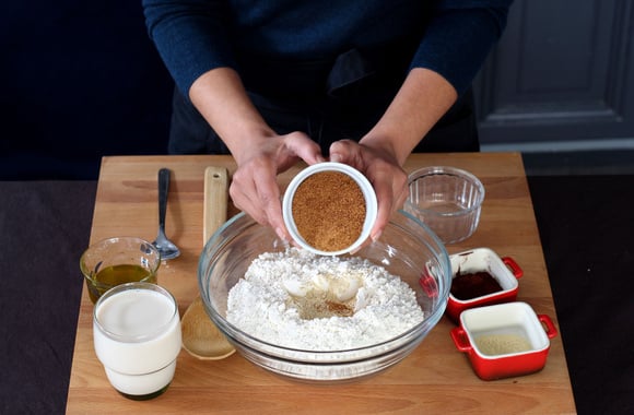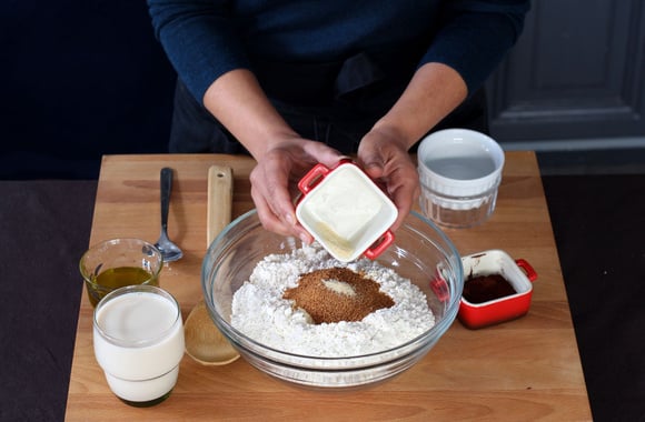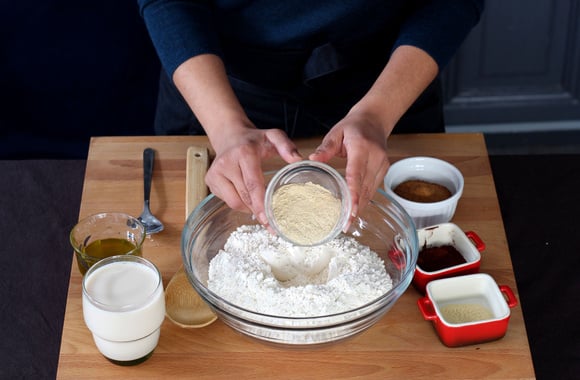1Mettez la farine dans un grand bol et ajoutez la levure sèche de boulanger.