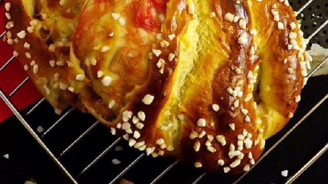 Préparation des brioches : Dégazer délicatement la pâte et l'étaler en rectangle d'environ 30 centimètres sur 15. Etaler la rhubarbe (égouttée) sur toute la surface en laissant 2 centimètres de pâte et rouler sur la largeur. Plier enfin ce serpentin dans le sens de la longueur puis bien souder. Toujours sur l'arête inciser sur toute la longueur pour obtenir deux brioches, puis tirer les bords des morceaux coupés pour refermer le tout. La pâte est très élastique et maniable cette étape se fait facilement et sans difficultés particulières (il se peut que la pâte casse un peu mais ce n'est pas grave ça permettra d'avoir un peu vu sur la farce gourmande !!!).