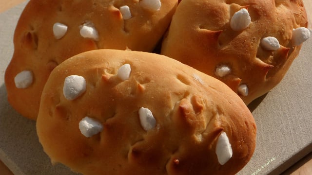 Poser la pâte sur le plan de travail fariné et façonner les briochettes environ chacune 75 g de forme ovale. Les poser sur une plaque couverte d'un papier sulfurisé et les laisser à nouveau lever sous un torchon.