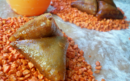 Petit triangle oriental garni aux amandes et épices, enrobé de miel chaud ! Un régal ...