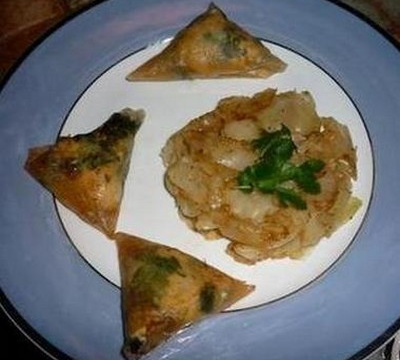 Assaisonnez le poulet avec les épices et les aromates. Coupez les feuilles de brick en 4 bandes. Posez une cuillère de farce sur un bord et plier en triangle. Renouvelez l'opération. Cuire les briouates dans une poêle anti adhésive 1m30 de chaque coté. - 2Accompagnement :