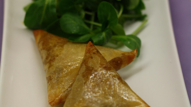Prendre 1/2 feuille dans le sens de la longueur, rabattre les côtés vers le centre pour obtenir une bande rectangulaire, placez une cuillère à soupe de farce à l'une des extrémités, mettez un morceau de fromage dessus, puis replier pour former un triangle en veillant à bien enfermer la farce. Collez l'extrémité avec un oeuf battu si besoin.
