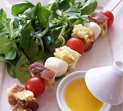 Pour la présentation, couper des tranches de cake puis détailler 6 carrés dans chaque tranche. Préparer les brochettes en alternant des tomates cerises, des boules de mozzarella et les cubes de cake.