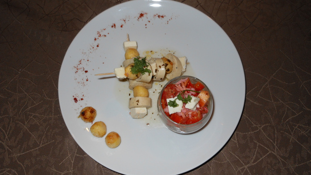 Brochette de boudins, de pommes caramélisées flambées au rhum, et des morceaux de chaource accompagné d'un salade de tomate et poivrons au biscuits de reims servis avec une vinaigrette