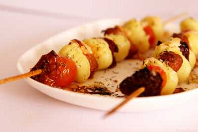 Disposition : sur des petits pics en bois, alterner : 1/2 tomate séchée, gnocchi, chorizo, gnocchi déjà cuit, tomate cerise,1/2 ½ tomate séchée. Ou pour faire plus petit : chorizo, gnocchi cuit, tomate cerise,1/2 tomate séchée.