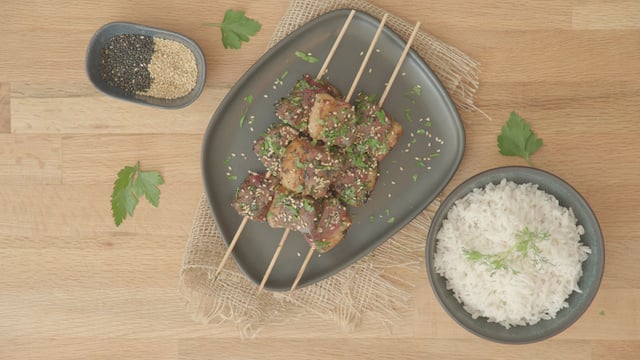 Faites cuire les brochettes à la plancha, ou à la poêle, en arrosant du reste de la marinade à mi-cuisson.