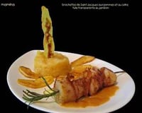 "...Evidemment le plat qu'on attendait ne pouvait qu'être à la hauteur de ces adorables petites tuiles... et les SJ pour toi n'ont plus de secret! Une fois de plus, c'est sublime : la brochette de romarin, la présentation des pommes...Bravo !...."