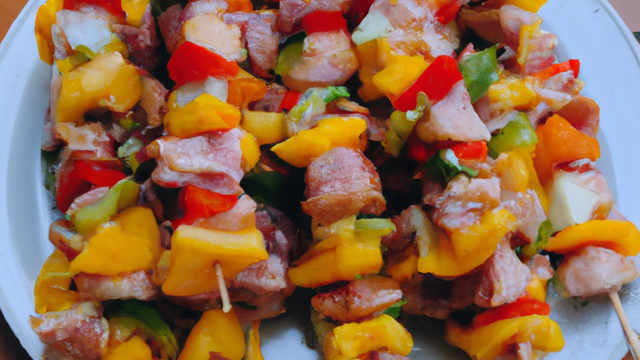 Brochette intercalant des morceaux de dinde, de filet mignon de porc, de dés d'aubergines et tomates cerise !