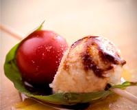 Déposer une bille de mozzarella et une tomate cerise sur une feuille de basilic. Embrocher le tout avec un pic à brochette en veillant à piquer les extrémités de la feuille de basilic.