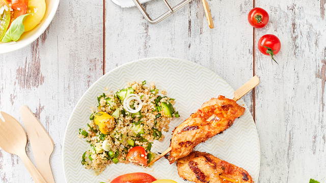 En enrober les filets en les frottant bien. Laisser mariner pendant au moins 3 h (ou une nuit) en retournant régulièrement. Mettre à tremper 8 brochettes en bambou dans de l’eau. Préparer le taboulé : rincer le quinoa et le faire cuire dans 1,5 fois son volume d’eau. Porter à ébullition et laisser frémir pendant 10 min. Réserver hors du feu à couvert pendant 5 min. Puis découvrir le quinoa et le laisser refroidir en l’aérant avec une fourchette.