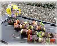 Une belle et bonne brochette de boeuf fondante bien assaisonnée .