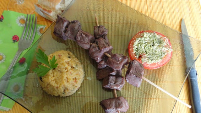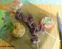 J'ai servi ces brochettes avec une tomate provençale cuite au barbecue et une timbale de céréales du soleil 'Tipiak'.