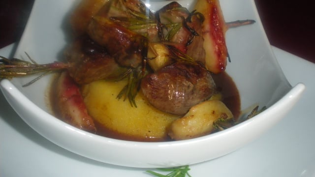 Monté sur des branches de romarin ces brochettes originales servies sur un cercle de polenta régaleront vos papilles