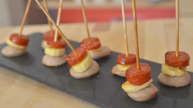 Assemblez en piquant tout d'abord une rondelle de chorizo, puis la banane et enfin le boudin.