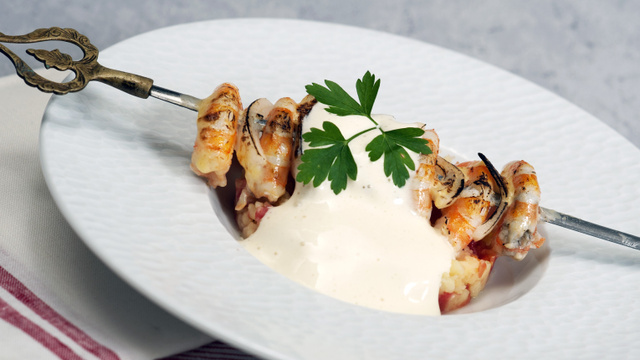 Dresser dans les assiettes. Poser les brochettes sur la purée et secouer à nouveau le siphon avant de déposer l'émulsion sur les brochettes ou à côté.