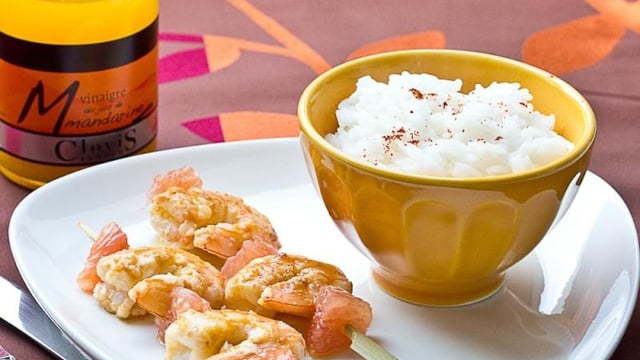 Des brochettes de crevettes marinées au vinaigre au jus de mandarine et de cubes de pomelo.