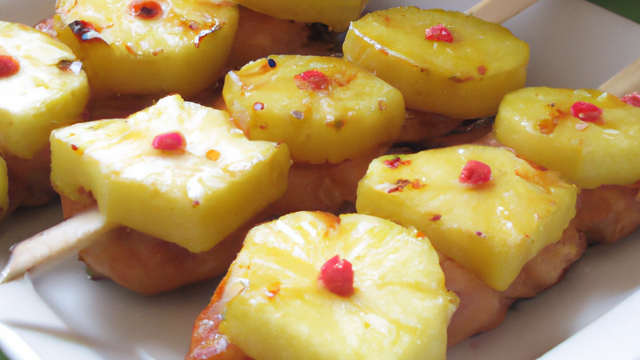 Brochettes exotiques à base de dinde et agrémentées de fruits.