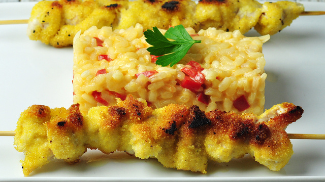 Servir le risotto bien chaud accompagné d'une ou deux brochettes.
