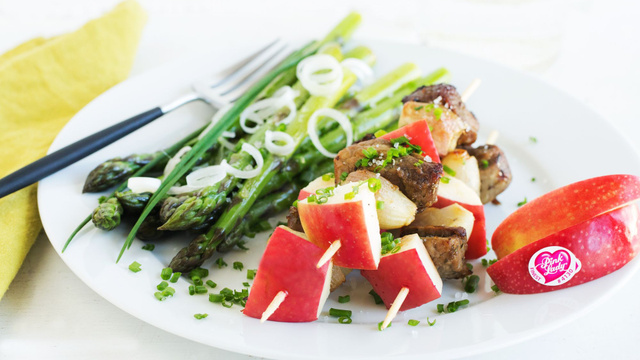 Sur vos piques, alterner les morceaux de filet mignon, les échalotes et les morceaux de pommes.