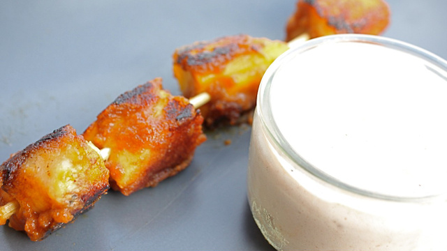 Pour le dessert, vous n'aurez plus qu'à mettre dans une assiette une brochette de fruits panés et un petit pot de chantilly aux marrons.