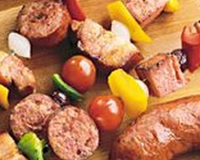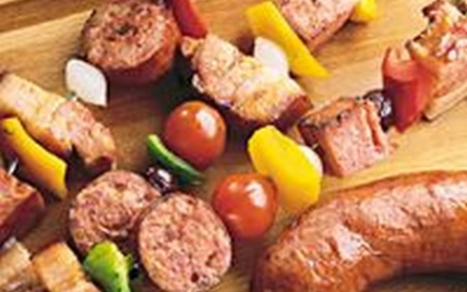 Délicieux plat principal, brochettes de lard fumé, jambon cru, saucisses de Morteau et saucisses de Montbéliard.