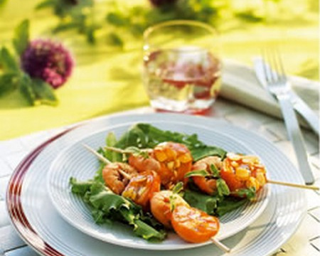 Composez 8 brochettes en alternant langoustines et abricots.