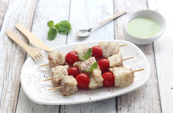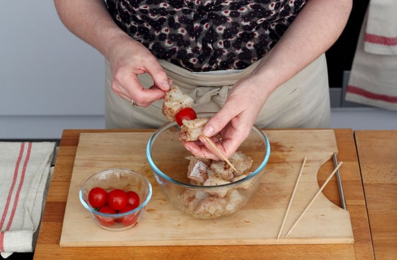 9Sur chaque pique en bois, alternez 3 cubes de poisson et 2 tomates cerise.