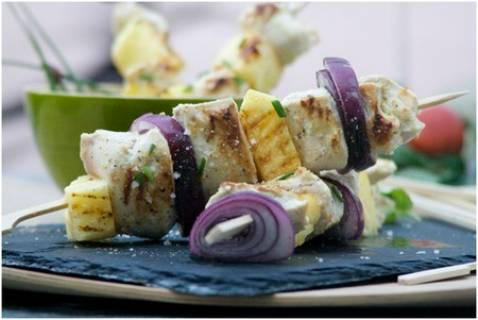 Egouttez les morceaux de poulet, enfilez-les sur les piques en bois en alternant avec les oignons et l'ananas.