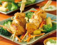 Sortez les brochettes du four et servez-les sur assiette accompagnées de légumes et de sauce Mayonnaise de Dijon® Amora.