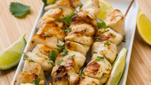 Lorsque le poulet est mariné, piquez les cubes sur des brochettes et saisissez-les au barbecue, ou à la poêle à feu vif.