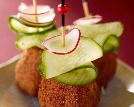 Servez-les sur des petites piques avec pour décorer les rondelles de concombre et de radis.