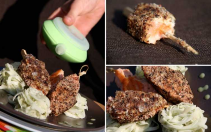 Petites brochettes de saumon et roquefort panées avec une croûte faite avec des noisettes moulues, des graines de lin, pavot et des épices dont du cumin. Servi avec une mayonnaise légère au wasabi et des tagliatelles de chou rave.