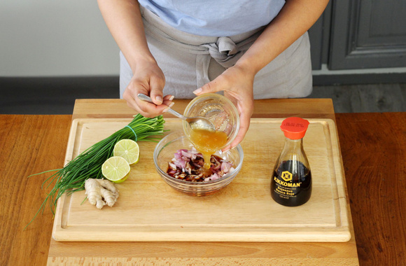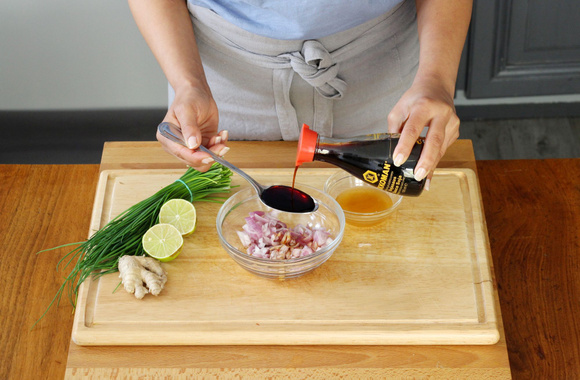 5Dans un bol, mélangez la sauce soja, l'échalote ciselée et le gingembre.