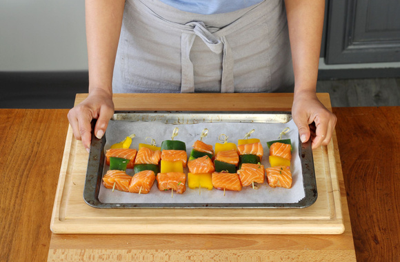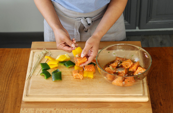 8Alternez sur des piques à brochettes les dés de saumon et les carrés de poivron.