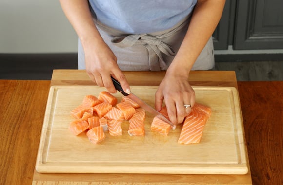 2Coupez les pavés de saumon en gros dés.