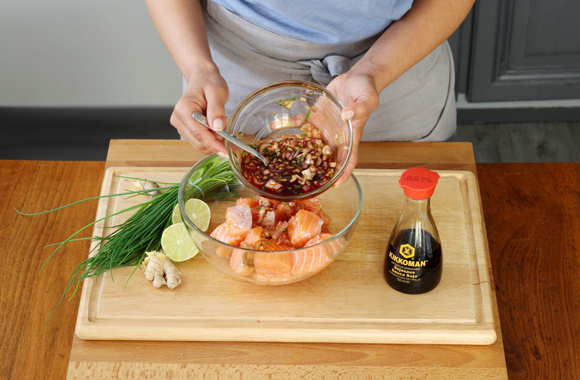 7Versez cette sauce sur les dés de saumon, mélangez et laissez mariner pendant 30 minutes.