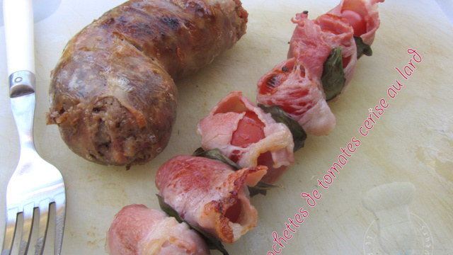 Sur des piques à brochettes, alterner des tomates cerise roulées dans des 1/2 tranches de poitrine fumée ou nature, des feuilles de basilic.