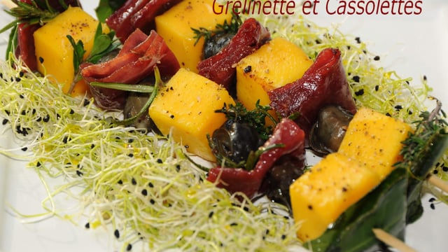 Les herbes aromatiques ont parfumé les escargots, le jambon et la mangue. Le speck a imprégné les escargots de sa saveur. Les escargot, juste revenus, sont tendres et goûteux. La mangue reste juteuse et le jambon est un peu ferme. Des brochettes ludiques, colorées et bien aromatisées !