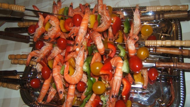 Enfiler les crevettes (décortiquées ou non selon vous) sur le pic de brochette et alterner les tomates cerises et les poivrons. - 2