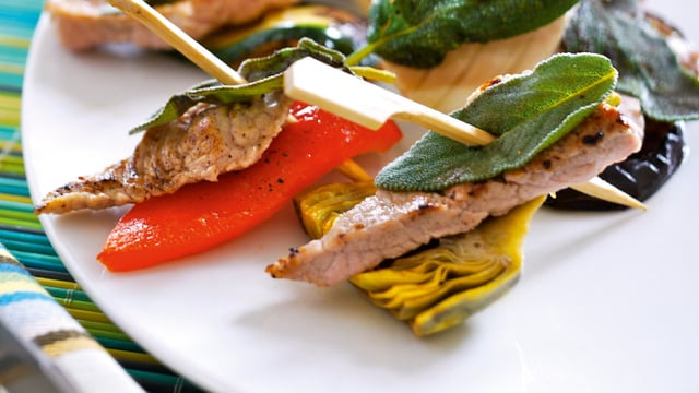 Faire colorer ces brochettes-saltimbocca à la poêle avec un filet d'huile d'olive, sur une plaque en fonte, à la plancha ou au barbecue, 30 secondes de chaque côté.