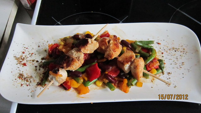 Yakitori de poulet à la marinade exotique sur lit de légumes d'été.