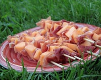 Sur un pic à brochette, vous alternez les morceaux de melon et les bandes pliées de jambon de Bayonne. - 2