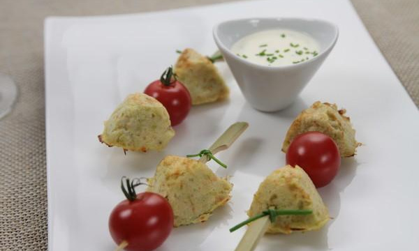 Petites brochettes de billes de flans au petit coraya et aux poireaux, intercalées avec des tomates cerises, accompagnées d'une petite sauce citronnée.