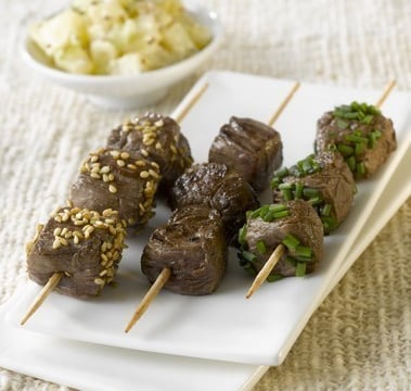 Nappez les brochettes de la sauce réduite et parsemez de ciboulette hachée ou de graines de sésame. Servez avec la salade de pommes de terre crémeuse.