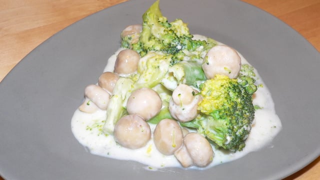 Salez et poivrez. Ajoutez les brocolis et les champignons. Laissez chauffer une dizaine de minutes à feu doux et servez aussitôt !