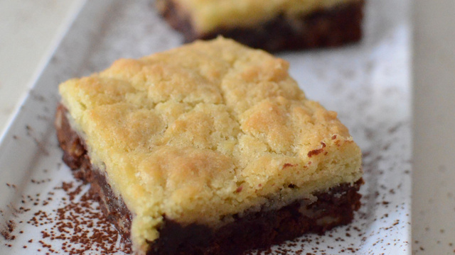 Parsemez la pâte à brownie de pâte à cookies en grosses miettes comme pour un crumble. Enfournez pour 30 minutes, à 180°C.