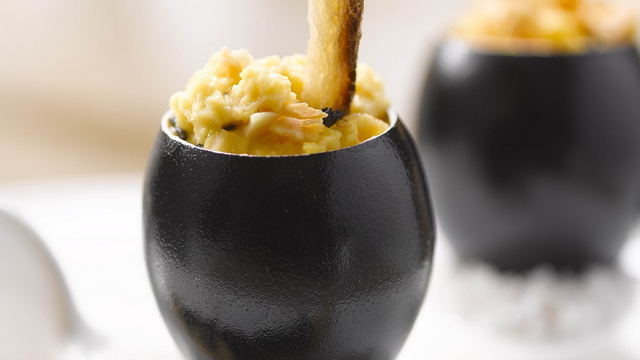 - 1Un jour avant (une heure au minimum)Casser les œufs dans un saladier, ajouter les brisures de truffe, les mélanger avec les œufs pour qu'elles infusent. Réserver au réfrigérateur dans un récipient fermé hermétiquement.