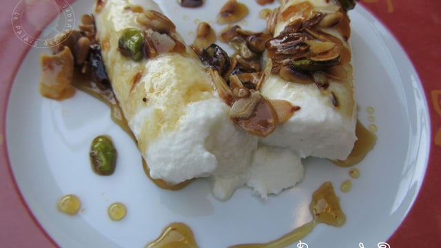 Faire torréfier à sec 1 c à s d'amandes effilées, 1 c à s de pistaches concassées, 1 c à s de pignons. Ajouter 1 grosse c à s de miel, 1 c à c d'eau de fleur d'oranger. Verser ce mélange encore tiède sur les brousses et savourer.