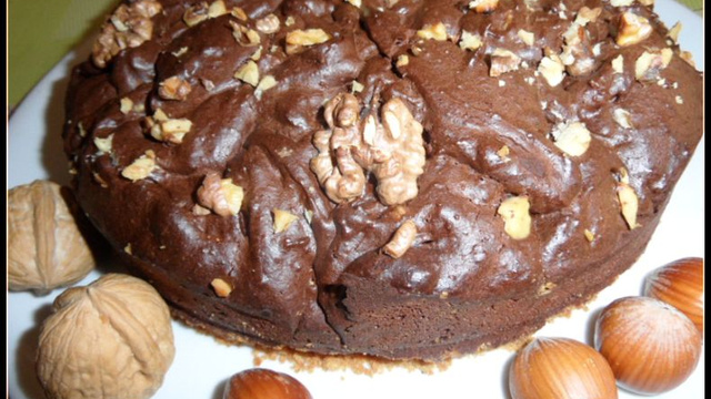 Couvrir de crème chocolat et noix. Garnir le dessus avec quelques cerneaux de noix et faire cuire 50 à 55 min. Sonder le centre qui doit rester moelleux.